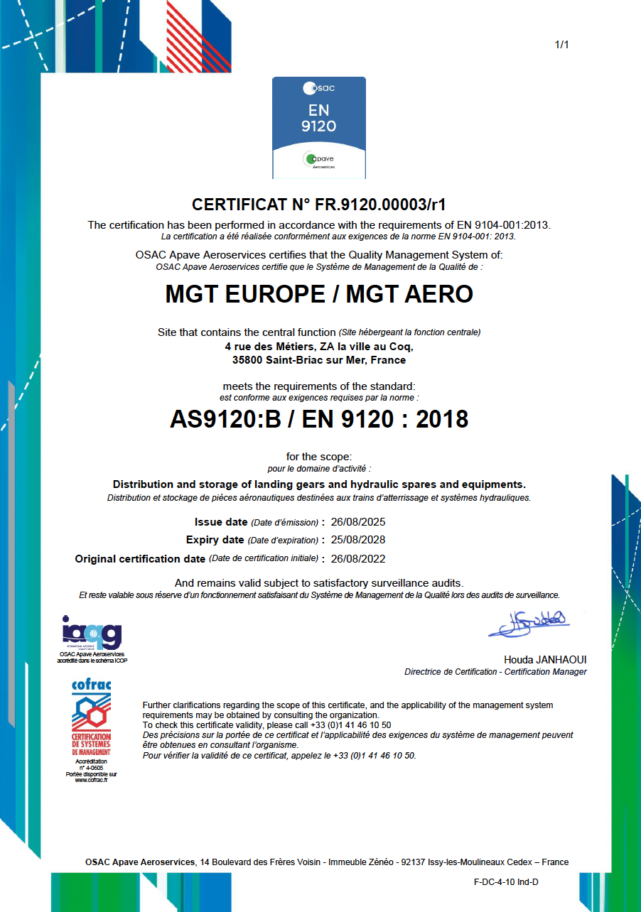 - Chaque pièce qui transite par MGT est inspectée à la réception ainsi qu’a l’expédition afin de s’assurer que l’ensemble de la traçabilité et des certificats livrés sont en accord avec les exigences de nos clients.